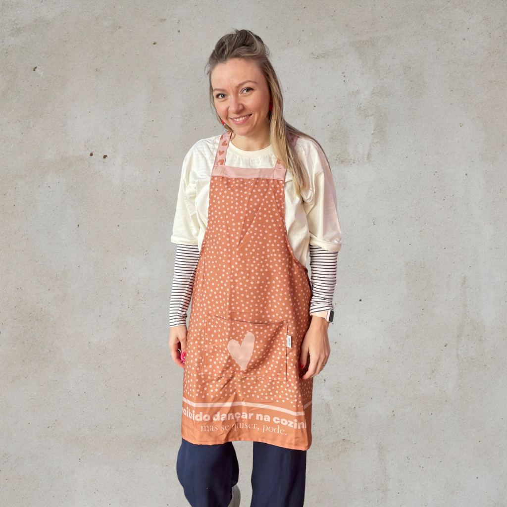 Feito em gabardine, um tecido leve, resistente e que seca super rápido, ele é perfeito pra quem vive entre uma receita e outra. Ah, e ainda tem bolso na frente — porque praticidade também faz parte da receita.