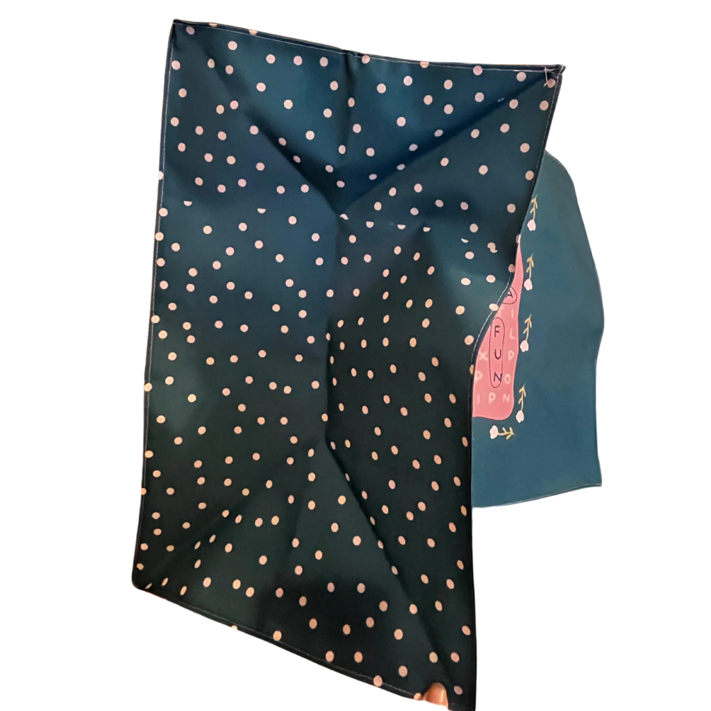 Feita em tecido impermeável com fechamento em zíper.